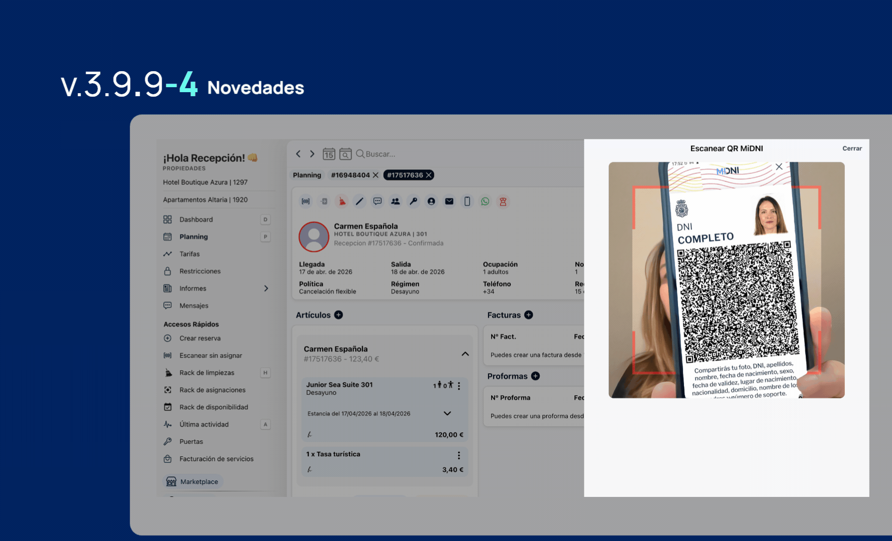 Desde el 2 de abril de 2026, los ciudadanos españoles pueden presentarse en recepción únicamente con el QR de su miDNI en el móvil, sin documento físico. Hotelgest ya tiene esta integración operativa desde el primer día, para que tu equipo pueda escanear y registrar huéspedes con el nuevo formato sin fricciones ni improvisaciones.