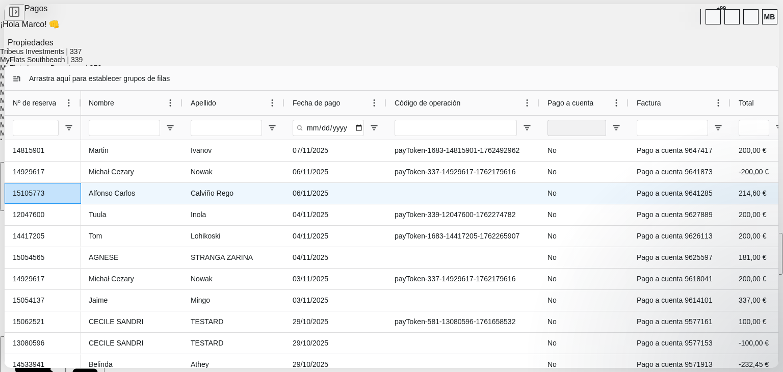 En el informe de pagos no hay una columna específica que muestre directamente la propiedad de cada pago en el listado principal.